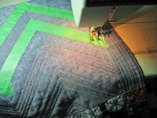I wasn't able to pick up the challenge fabric until last Thursday's guild meeting. I got started on the tote on Saturday, but was busy all day Sunday, so really had to hustle to have this done for Tuesday morning to drop it off to one of the gals as we were heading out of town. I stayed up till 3 am Monday night, before I finally packed it in. I finished the handle in the morning, a bit bleary-eyed, I might add.